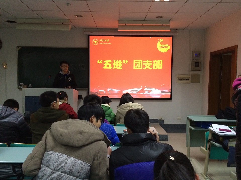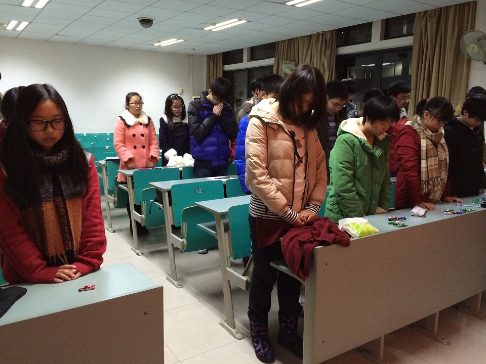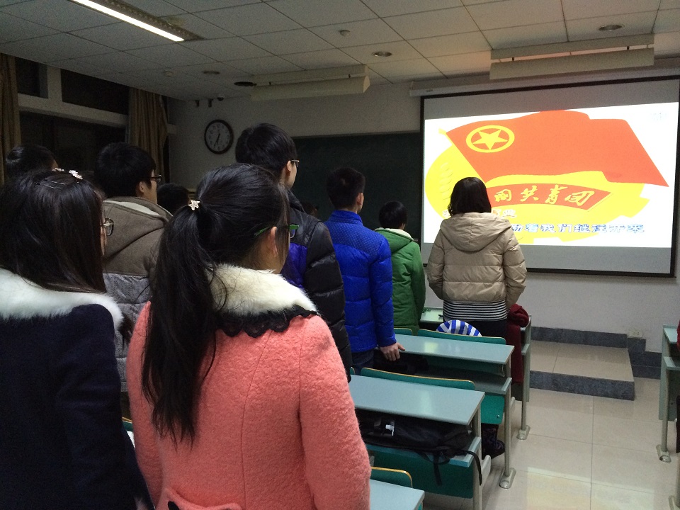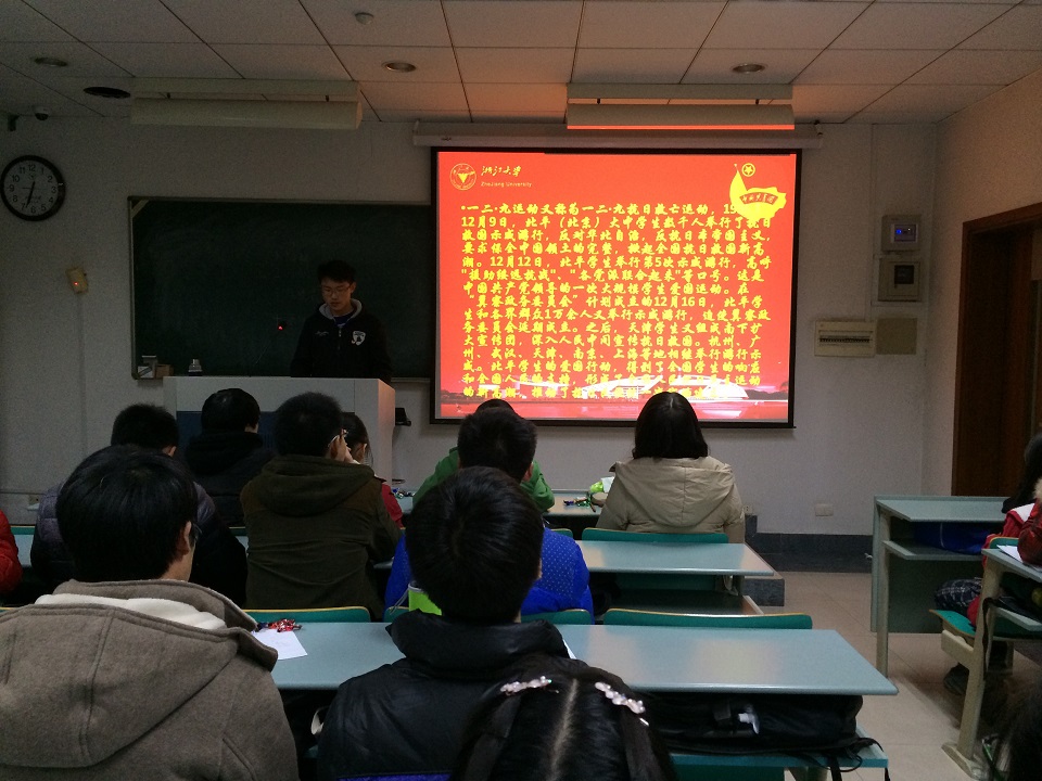 班团活动开始,我们进行第一环节,为七十七年前在南京大屠杀中逝去的同胞默哀三分钟,之后团支书为大家大致地讲解了一下129运动的背景、爆发时间、地点、主要参加对象、举办目的、规模程度等等,回顾了一二九运动的过程。唱团歌,是班团活动必不可少的一个环节,虽然歌声并不是很嘹亮,但是团歌的氛围还是很浓厚。