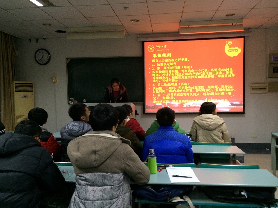 接下来就是活动的大头了——答题竞赛。参赛选手分为四组,每组四人,两组男生,两组女生。主持人解读了一遍活动规则,竞答分为必答题和抢答题两轮。第一轮开始,四组各答十道题目,一轮结束后,其中三组以七十分平分领先。第二轮开始,主持人虽然一再强调要在读完题说完开始答题之后抢答,不然进行扣分惩罚,但是由于主持人腹黑的小宇宙在燃烧,开始两题有两组踏入此坑。最后第二组因为杨明同学的活跃表现,以90分获得第一的佳绩,第四组以70分获得第二。然后我们所有参加活动的人与主持人一起将最后的加时赛13道题目做了一下。