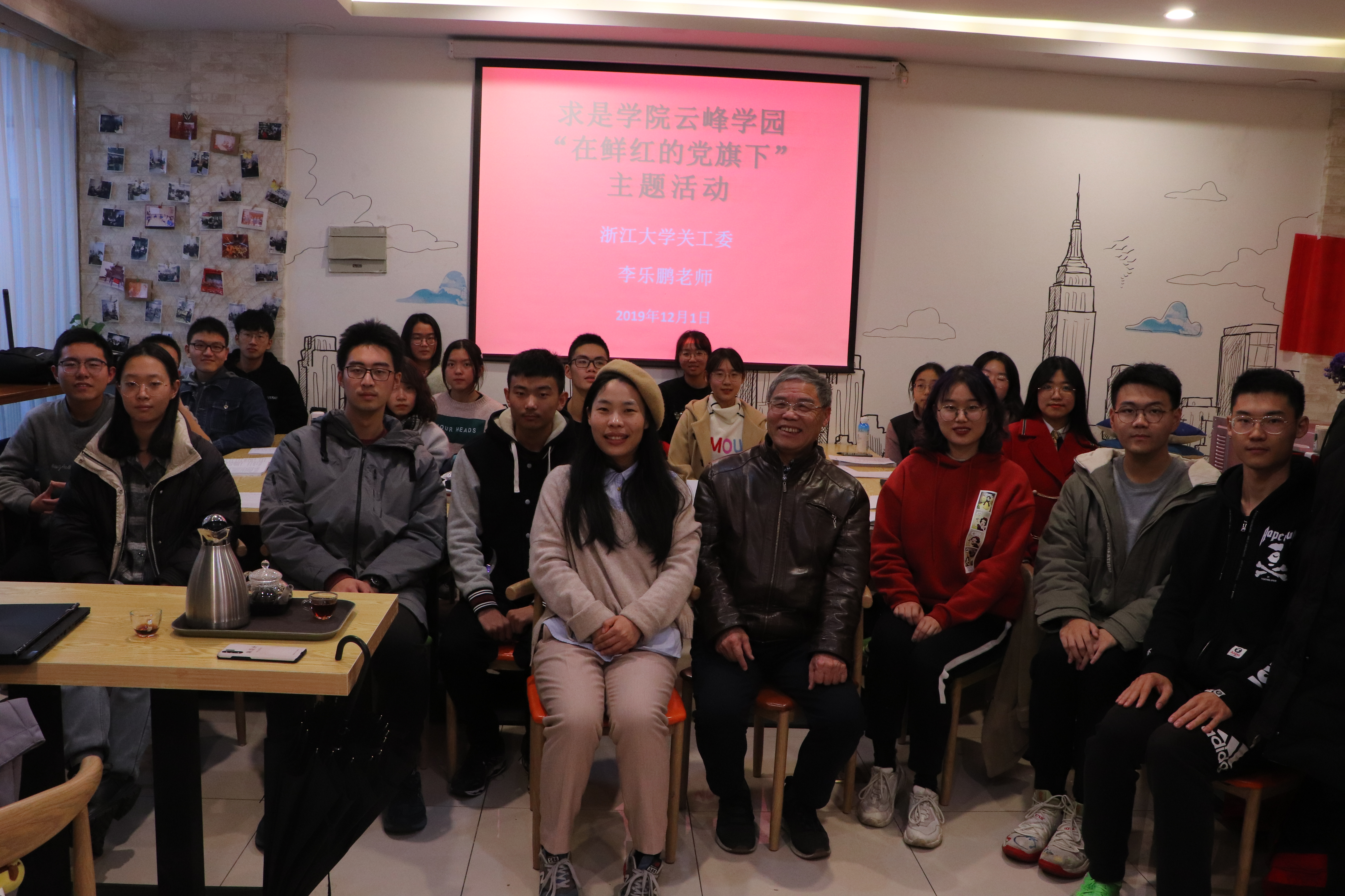 2019年12月1日下午19:00,浙江大学求是学院云峰学园“在鲜红的党旗下”主题活动在蓝田咖啡吧举行,浙大关工委求是宣讲团李乐鹏老师、云峰学园分团委副书记陶虹向老师莅临讲座,云峰学园各党章学习小组组长参加讲座。