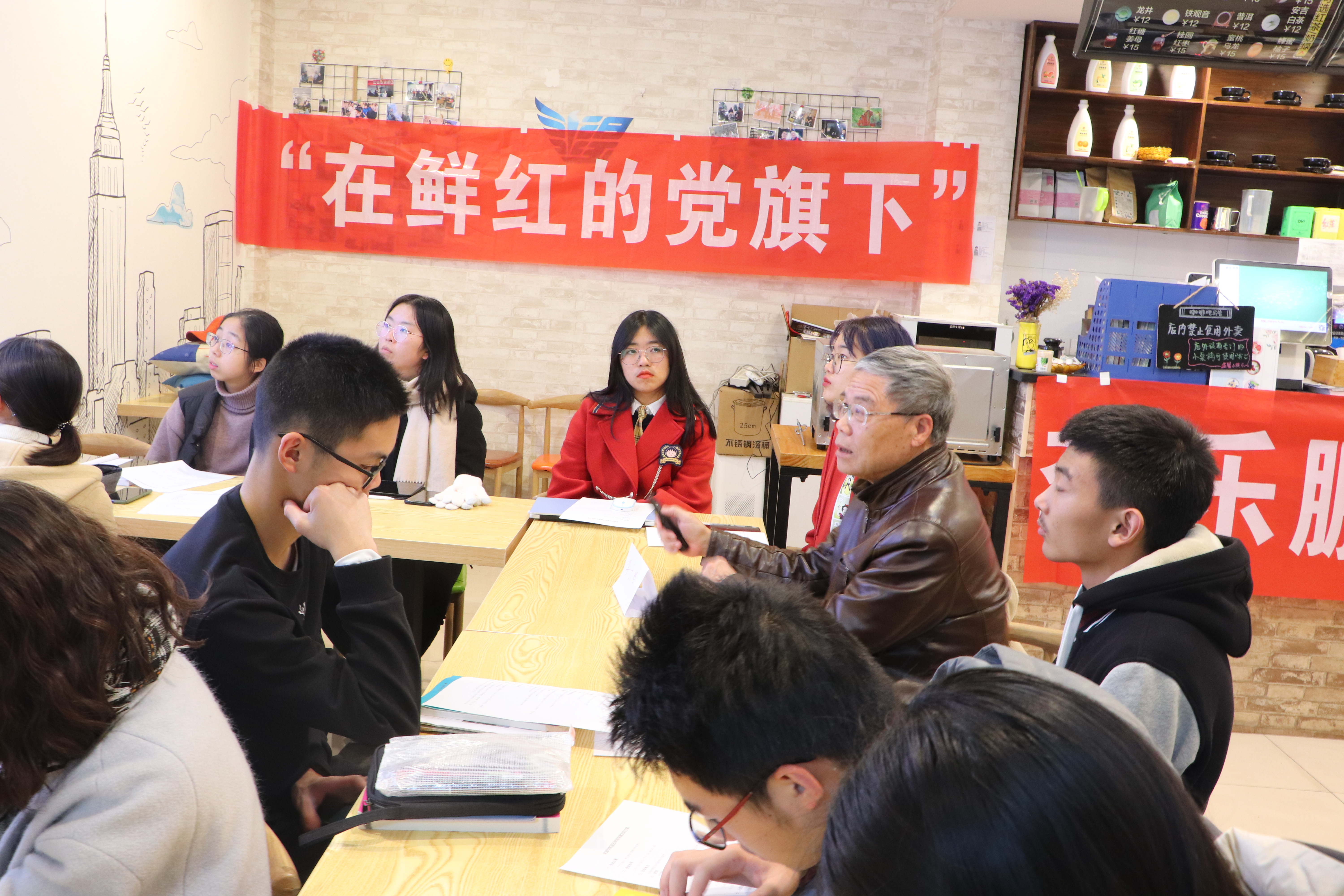 在咖啡吧狭小的空间里,同学们与老师近距离接触,面对面交谈,营造了良好的互动氛围。李乐鹏老师首先向同学们提出一个问题:“大家看今年的国庆,有没有什么感想?”,谈到“我个人体会,不仅仅是新中国从站起来、富起来到强起来,中国共产党一路走来不容易。”进而围绕这个“不容易”回顾了中国共产党在早期的革命斗争年代所走过的道路。