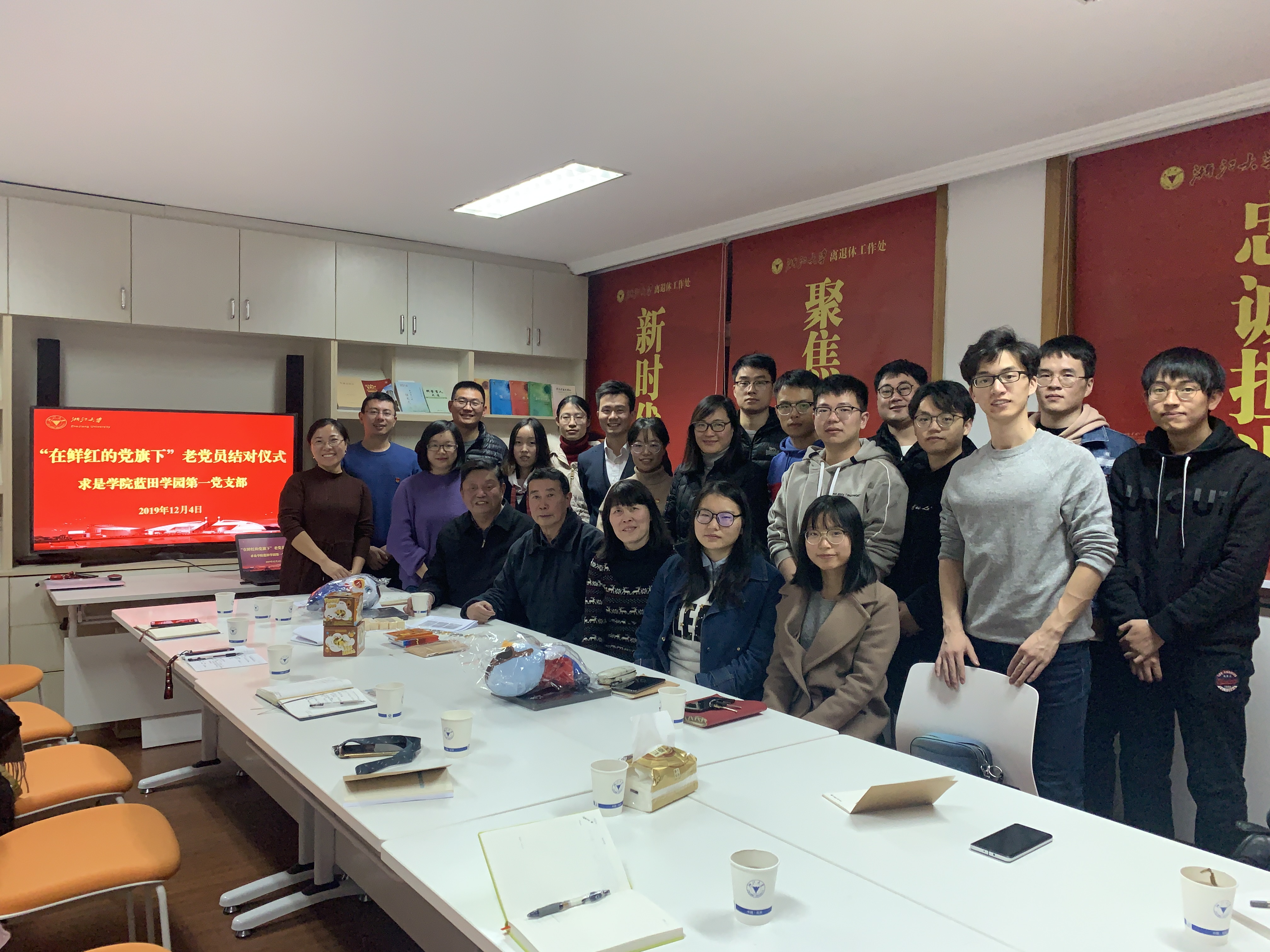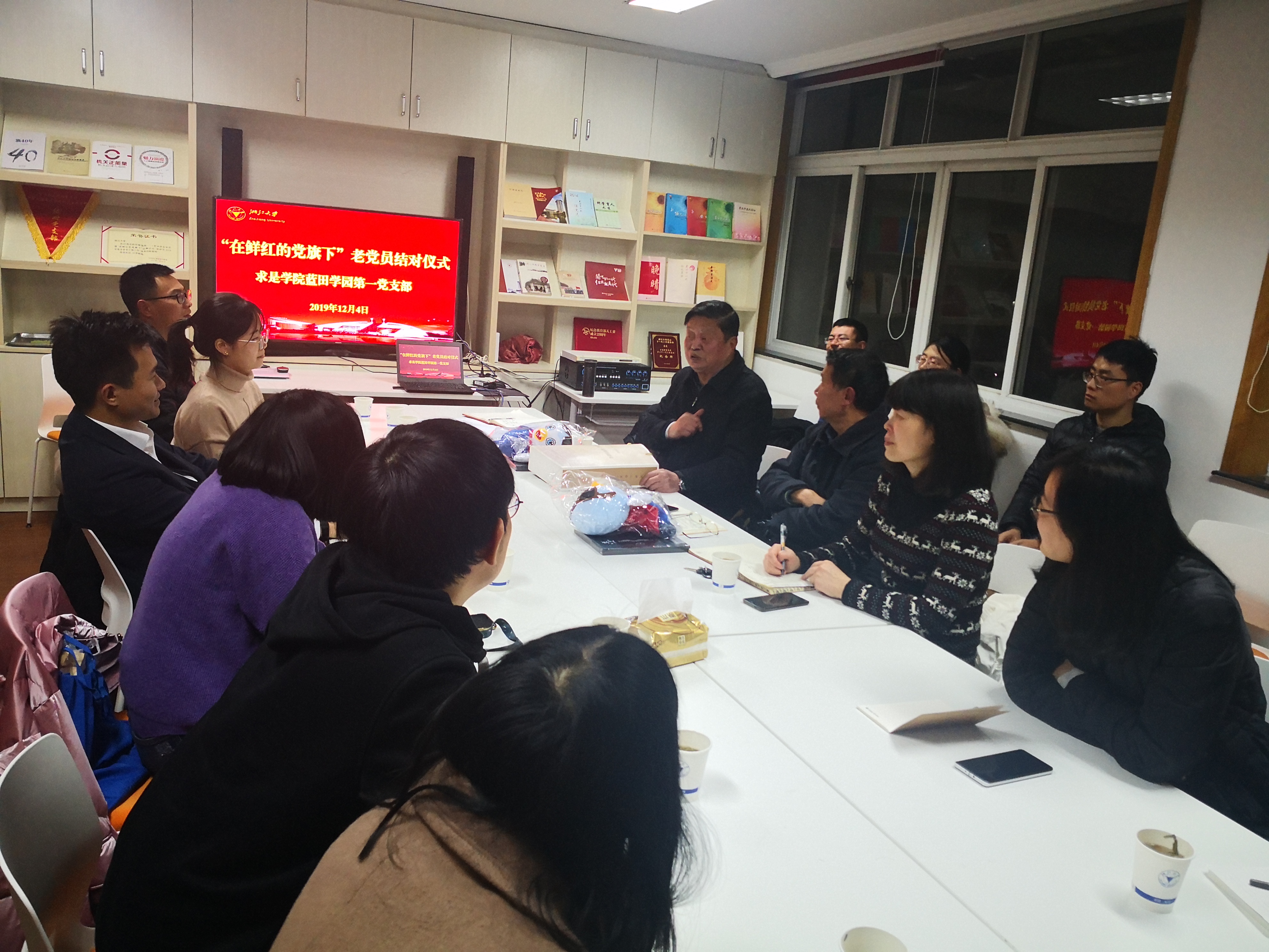 2019年12月4日,蓝田学园第一党支部在玉泉校区教工活动中心406室举行老党员结对活动,离退休工作处常务副书记、关工委秘书长朱征、关工委求是宣讲团成员、“网红魔术”教授庄表中,关工委求是宣讲团成员、传媒与国际文化学院原党委书记张梦新教授、蓝田学园第一党支部全体党员参加结对活动。