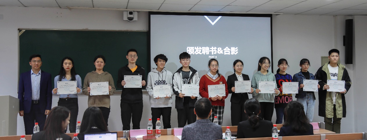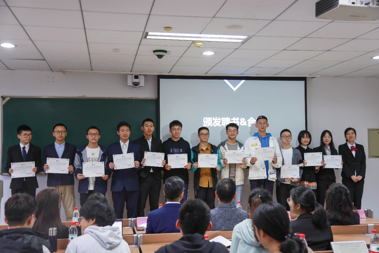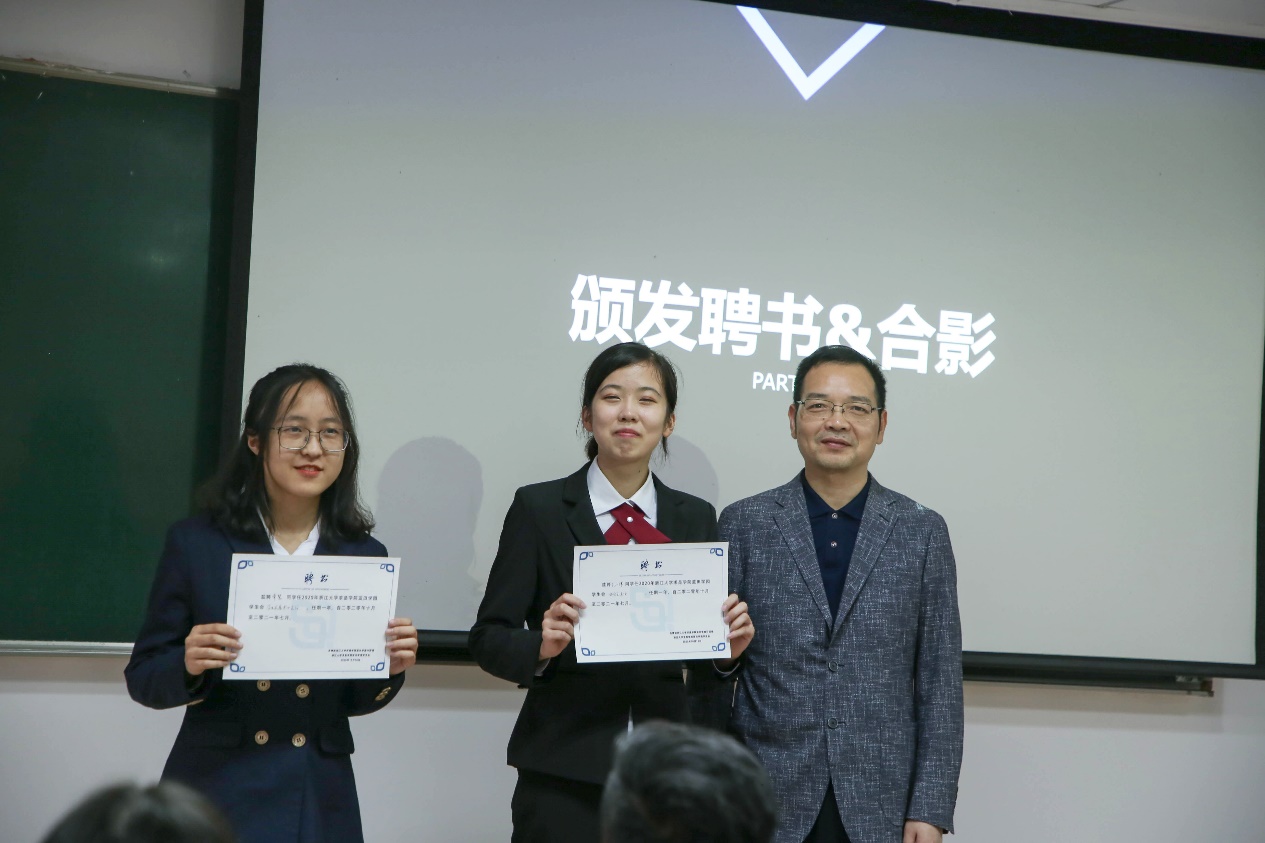 随后,伴随着热烈的掌声,陈立明老师为主席团颁发聘书,徐本涛老师为理事会成员颁发聘书,蓝田学园学生会直属办公室主任孔一博为办公室干事颁发聘书并合影留念。