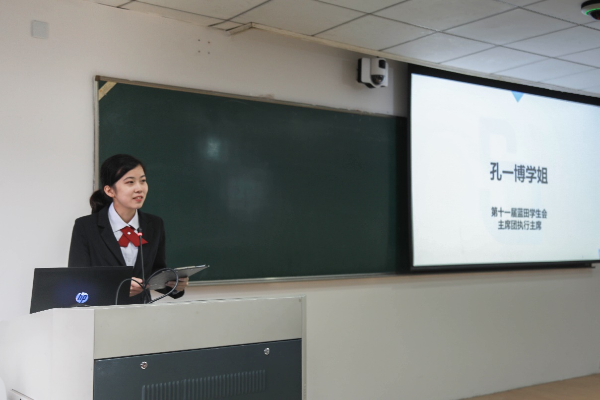之后,第十一届蓝田学园学生会主席团执行主席孔一博讲话并对学生会新一年的工作做了具体要求。她提出,学生会应明确自己的定位,树立服务同学的团队形象,在改革的浪潮中抓住机遇,让蓝田学园学生会展现出新的活力,她鼓励成员们锻炼自己的能力,实现自身的价值。