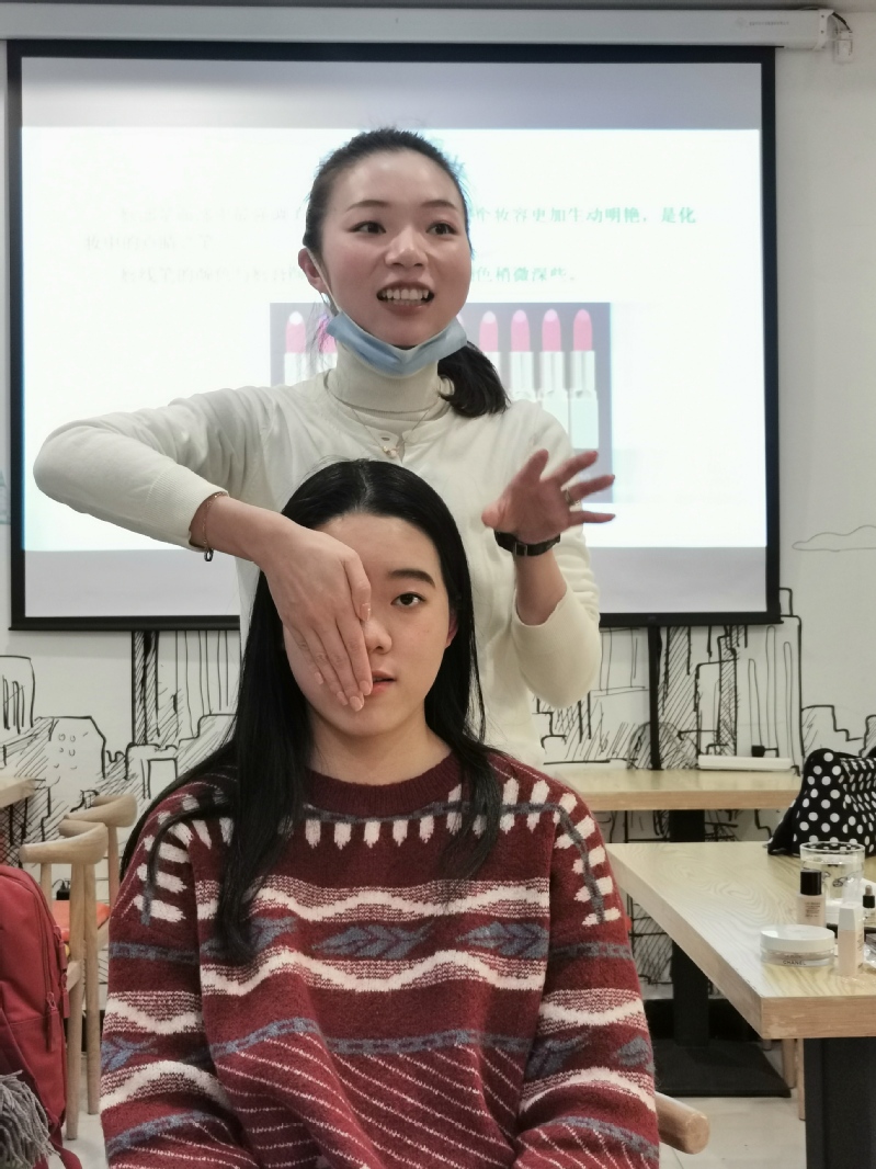 第二个部分是进行现场教学,邀请现场一位同学配合,梁老师通过边化妆边讲解的方式向同学们展示了化妆的步骤、手法和注意事项。