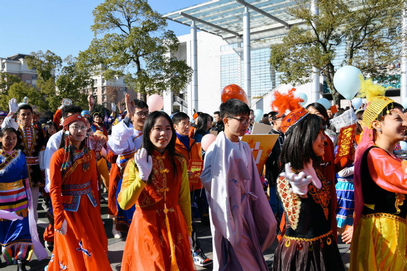 巡游途经丹青学园、蓝田学园与云峰学园,我院方阵热情地向道路两旁观众打招呼,并高喊“同呼吸、共命运、各族人民心连心,讲团结、谋发展、祖国大地共和谐“、”唱响团结主旋律,谱写发展新篇章;民族就像石榴籽,紧紧拥抱不分离”、“丹青精英 威震紫金 倚天翰墨 通古博今”等口号。至方阵行至月牙楼处,丹青学园本次巡游落下了帷幕。