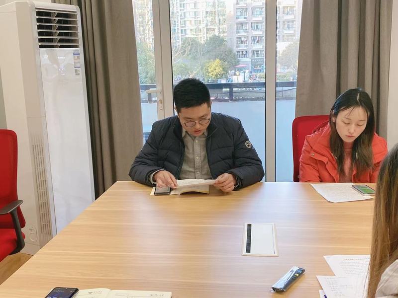会议开始,陶安娜老师首先带领支部党员认真学习了党中央和上级党组织有关文件精神,通报了党员参加组织生活、缴纳党费,以及支部目前在开展的入党积极分子“五个一”工程、“诵经典•忆初心”经典诵读接力活动、英语学习社等支部特色项目的开展情况,并详细汇报了党支部前期征求群众意见、支委间深入谈心谈话等具体内容。