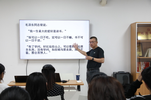 邱利民老师为大家带来“毛泽东青年时代的成长对求是学子的启示——KAQ2.0的视角”主题党课。首先,邱老师询问在场人员近期读书的情况,接着从“运用的主要研究方法和信息来源”、“研究毛泽东青年时代的原因”、“对求是学院青年学子的启示”三个方面展开党课分享。邱老师主要应用文献研究、实地调研和专家访谈等科学的方法,通过解耦和耦合的方式,从KAQ2.0——知识、能力、素质、人格的视角,对毛泽东的青年成长历程和事迹进行总结分析。邱老师用联系和发展的眼光将青年毛泽东和青年马克思进行了比较,总结出他们在知识储备和文化旨趣、人格气质、政治活动、思想转变等方面的共同之处,邱老师强调,伟大人物青年时代的成长发展历程是一项值得长期坚持、不断深入的研究,对于当代青年大学生的培养教育具有重要的参考价值和借鉴意义。邱老师强调,毛泽东是伟大的,青年时代的成长是有规律可循的、可借鉴、可学习的,“知识就是力量,读书改变命运”,毛主席正是利用青年时代读遍有字之书和无字之书,才会形成独到的人生见解和巨大的人格魅力,才能在后期领导党和人民群众进行革命斗争并建立起新中国。邱老师结合自己读书的经历和感悟,告诫大家要向伟人学习,与优秀为伍,利用好宝贵的资源和广阔的平台,养成读书的习惯。