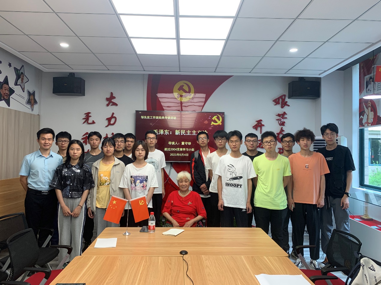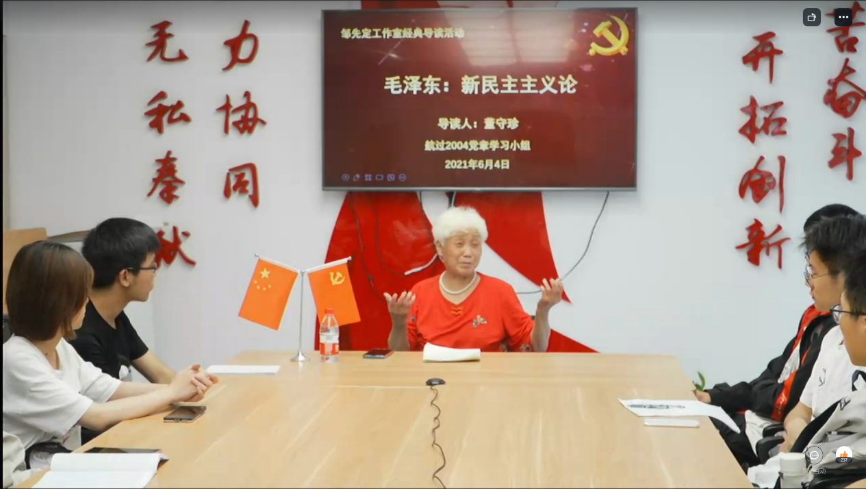 2021年6月4日下午,求是学院蓝田学园邀请关工委宣讲团成员、老党员董守珍老师为航过2004党章学习小组作经典导读,分享了对毛泽东《新民主主义论》的心得体会。同时,导读活动也面向整个航过大类的同学进行了直播。