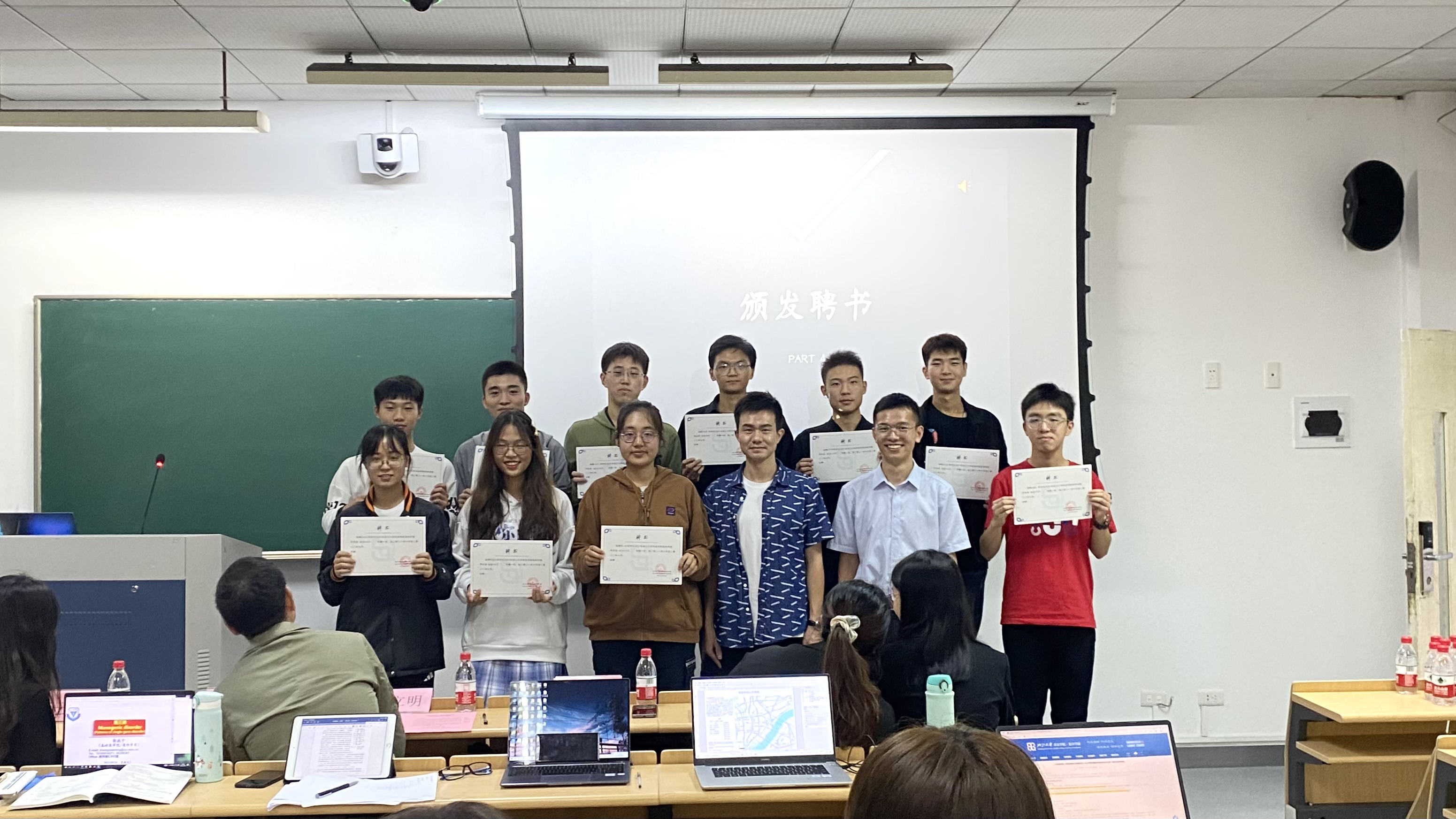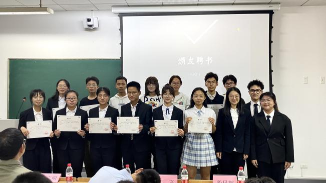 新老主席团发言后,就到了颁发聘书环节。伴随着热烈的掌声,陈立明老师为主席团成员颁发聘书,董业凯老师和李金城老师为理事会成员颁发聘书,主席团成员为干事们颁发聘书。