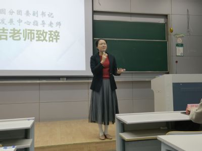 之后,车淼洁老师上台致辞。车老师强调,大家在学业发展中心这个组织相遇,应该成为一个温暖的、友爱的集体。同时,车老师也希望在组织里每个人都能满怀热爱,把握机会,学本领,长技能。此外,车淼洁老师呼吁,学展中的每一分子都能积极出力,对蓝田学园有所贡献,在学业建设方面有所成绩,为广大同学共同创造青春记忆,留下美好故事。最后,车老师向全体干事表达了祝愿,希望大家能在学展收获友谊,收获成长,收获成就。