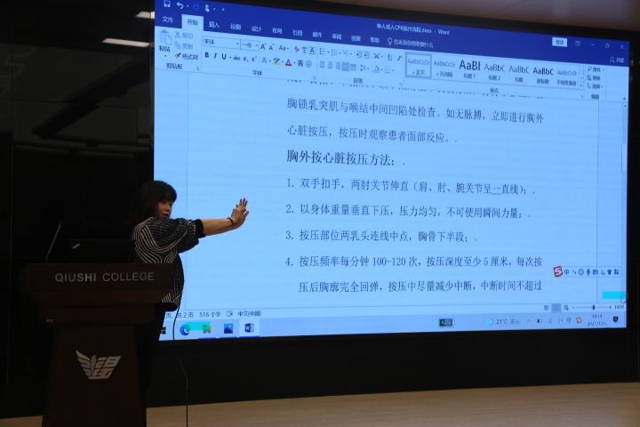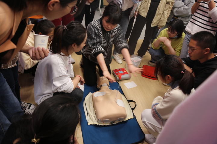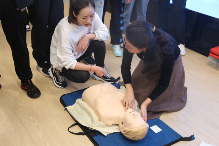 浙大妇院的护理技能小组韩蓉老师细致地讲解了单人和双人体 外复苏的步骤,从大致上了解 CPR 的重点,如何判断被救助者的意识、按压的手法、深度、 频率,如何打开气道、AED 的使用方法等,使得学生们在大脑中形成一条井然有序的时间生命线。最让同学们印象深刻的是,由浙大妇院的胡苗苗老师联合韩蓉老师进行的实践技能 操作,在模特身上进行实操演示,真切地让学生们感受到了所谓的黄金五分钟。工科试验班(海洋)2102班学生黄梦圆表示,看着胡老师和韩老师的演示,一股暖流涌上心尖。这是一次严肃宝贵的救治,是一种冲上前头的勇气,是一种责无旁贷的使命感,是一种对于生命的渴望。接下去,同学们都跃跃欲试,纷纷进行了练习。“自己尝试后才会发现原来简简单单的按压和人工呼吸还是有很多奥秘在其中, 短短的两个循环、五个循环还是会如此累人的,黄金五分钟的抢救时间还是会如此宝贵不容小觑”,黄梦圆同学如是说。在每个人的训练环节,老师们不停地纠正与指出不足之处,尽可能地做到严格要求,让学生体会到奋战在一线的急救医护人员的伟大。