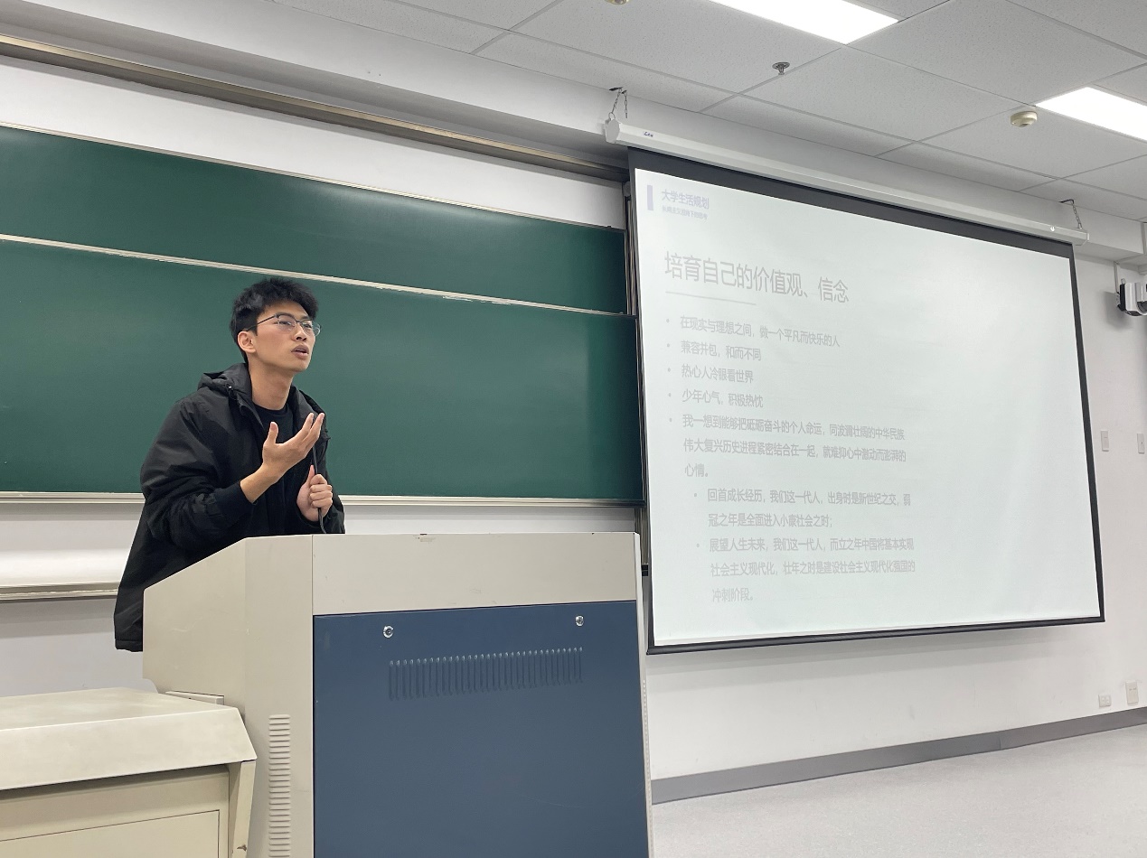 然后,三名学长学姐带来了他们的交流与分享。来自丹青学园第四党支部的研究生、社科2116班的兼职辅导员傅浩东学长讲述了他在大学的相关经验,他以“大学生活规划—长期主义视角下的思考”作为主题,讲述了他在教育学保研、国家级SRTP、学生组织等等的相关经历,他提出用大视角、大问题的角度去思考人生规划方向,建议同学们要有意识地寻找定位,追溯时间流逝的意义,记录阶段性的变化,学会关注成长本身而不是绩点或者荣誉,关注知识与理论,培育自己的价值观与信念,学会做自己的长期主义者,最终迎面走向未来所需要的东西。“我一想到能够把砥砺奋斗的个人命运,同波澜壮阔的中华民族伟大复兴历史进程紧密结合在一起,就难抑心中激动而澎湃的心情。”他极具大局观的讲述使同学们深受震撼。