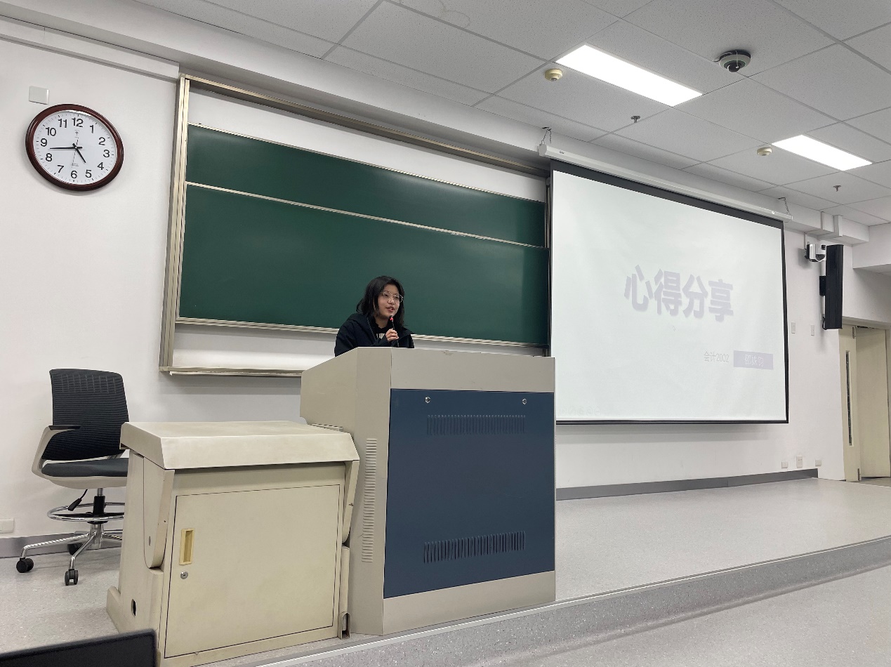 最后,社科2116班学长组燕天润学姐讲述了她自己应对精神内耗的方法,包含时间规划和记录自我两方面。她从学习篇、运动与艺术篇、社会工作篇等方面逐条进行了讲解。