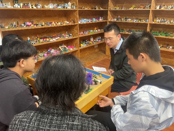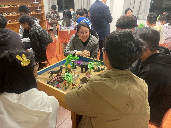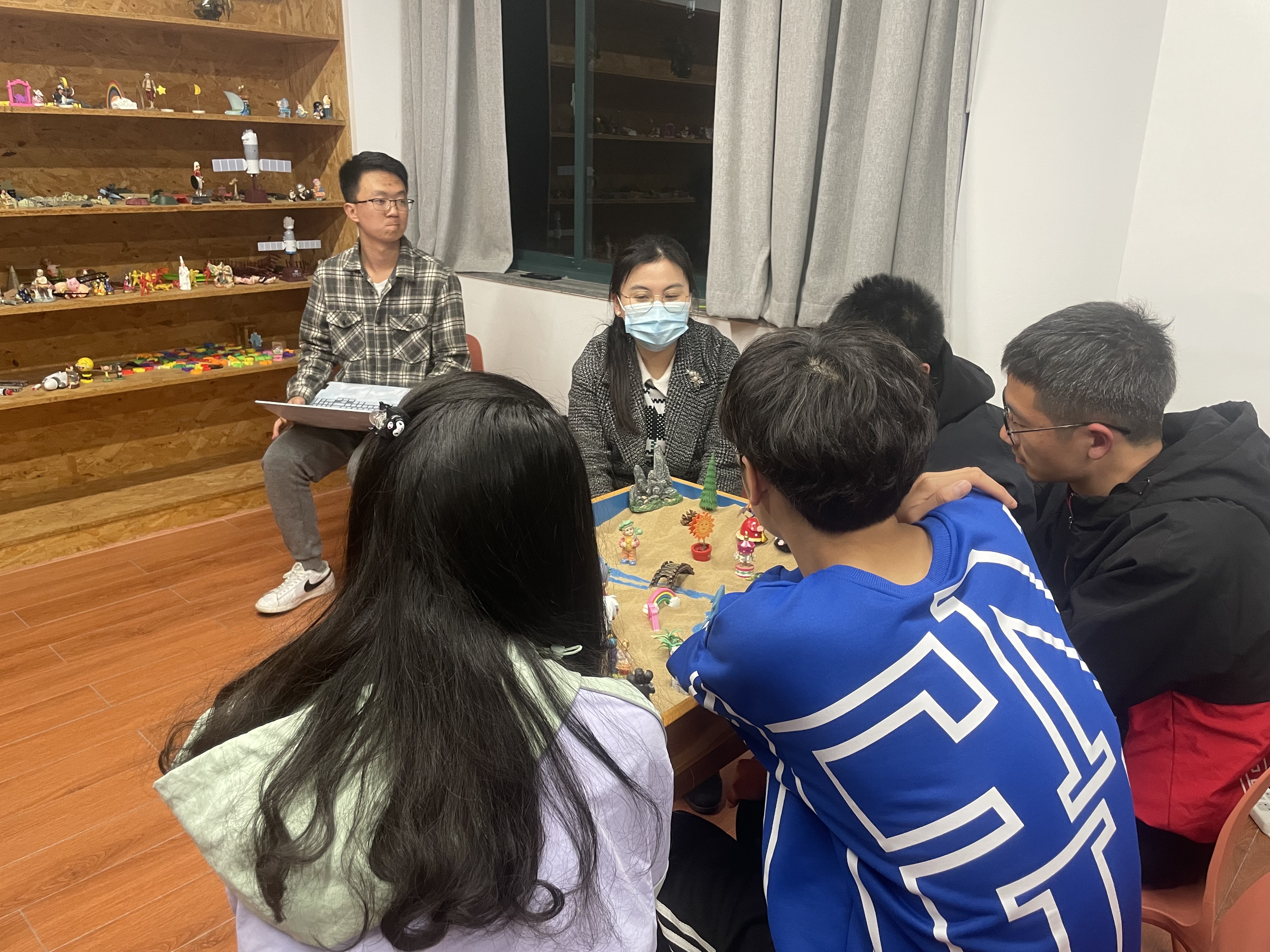 进入到团体沙盘游戏。在包老师介绍了团沙的规则之后,各小组开始挑选与摆放沙具,同学们的沙盘逐渐丰富起来,形成了各有特色的场景:大海、森林、庭院……在沙画成型后,小组内的同学分享自己在每轮拿的沙具、拿沙具时的感受。轻松、有趣的游戏氛围也让他们倍感减压与放松。陪伴师通过让同学们给沙画命名,追问团沙过程中的感受,尤其是发生互动与冲突时的感受,深入挖掘同学们感受自身的情绪和感觉,引领同学们进行自我探索。