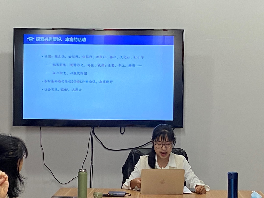 已经推免至哲学院逻辑学专业的2018级哲学专业的姚泽来学姐从自己的大学经历出发,启发大家利用时间去探索、外拓和发现自我。她认为,在本科期间尤其是低年级阶段,需要积极探索,进行有效交流与尝试,沉淀自己、走出迷茫;同时,以兴趣为导向主动外拓,可以在升学、专业等方向多多探索,但需注意收放自我;最后,“发明本心”、发现自我,在真正了解自己的基础上做出选择,过渡到稳定持续的状态中。