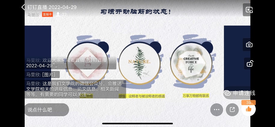 学姐们的个人分享结束后,参与活动的同学们积极主动与学姐们交流自己的困惑,学姐们也都一一解答,气氛热烈,钉钉直播中线上的同学也对学姐们表示了感谢。希望学长学姐们的经验能够帮助大一的同学们更好地适应专业学习,渡过迷茫倦怠期,更好地规划自己的学习和生活,并为心中的美好愿景而不懈奋斗。