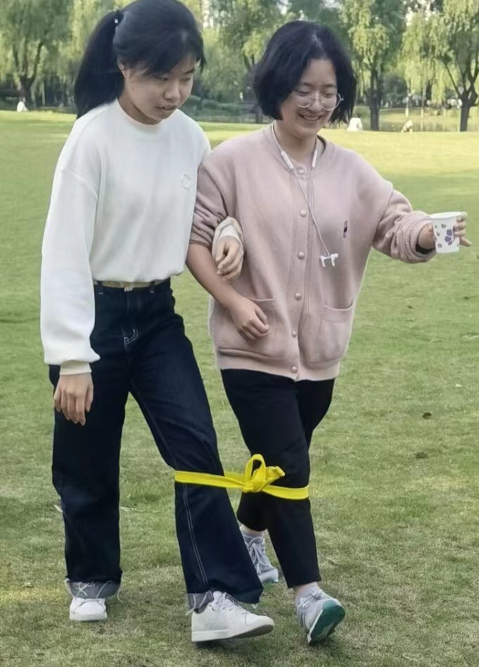 在西区大草坪打卡点,“托人带水”活动也顺利进行,灿烂阳光下,两人或三人一组,在“一二一二”的口号里,欢声笑语中同学间加深互相了解,加深彼此的默契,助力人际关系健康发展。