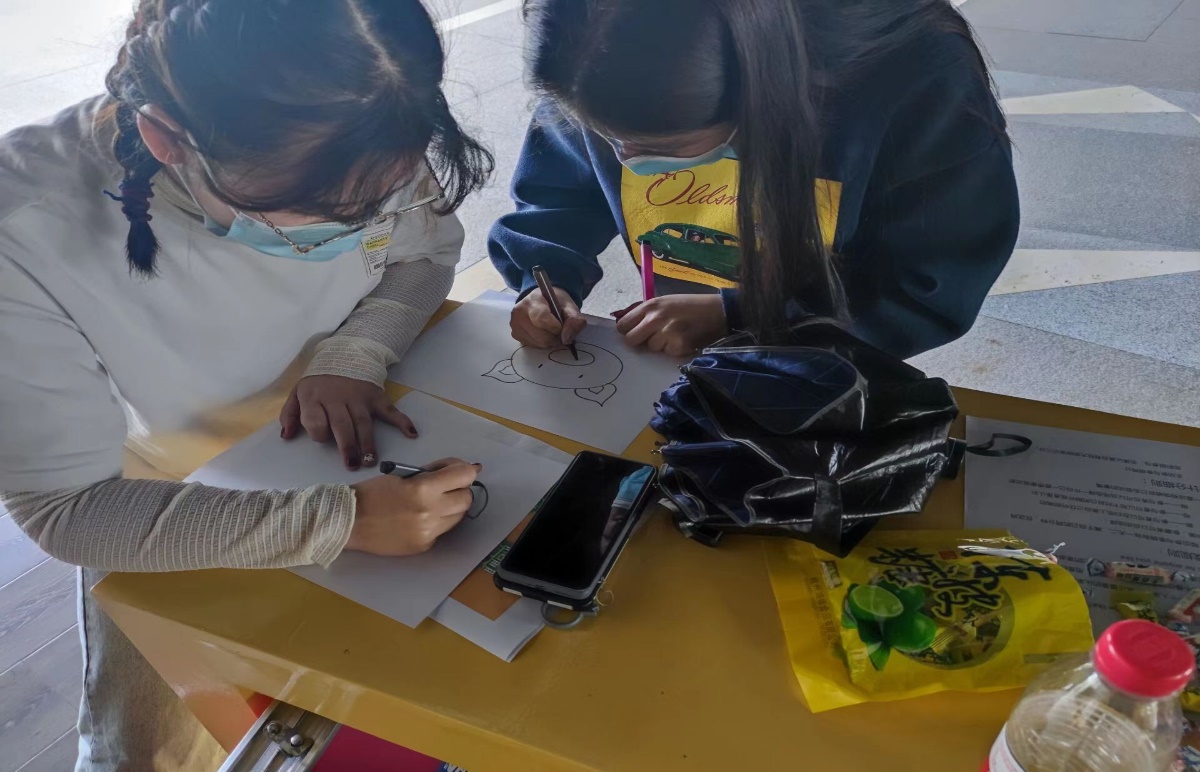 在月牙楼打卡点,同学们满怀欣喜地用画笔绘出心目中的最好的自己,各种各样的图画寄托着同学们美好的期望。