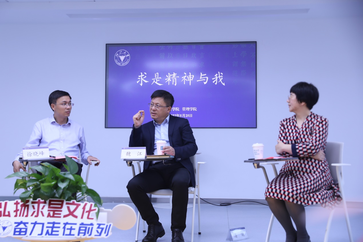 活动伊始,魏江院长以自己刚刚结束的浙江大学2022年教材工作会议暨首届全国教材建设奖表彰会为引子,从“21年写一本教材”阐述了他对“求是”的初印象——坚守、精品与责任。二十一年如一日不断迭代优化一本教材,恰恰是魏院长对于教师这份职业选择的责任体现,他勉励同学们,要坚守“只问是非、不计利害”的科学精神,朝着正确的方向,实实在在做好一件让人尊重的事,直至做到最棒。