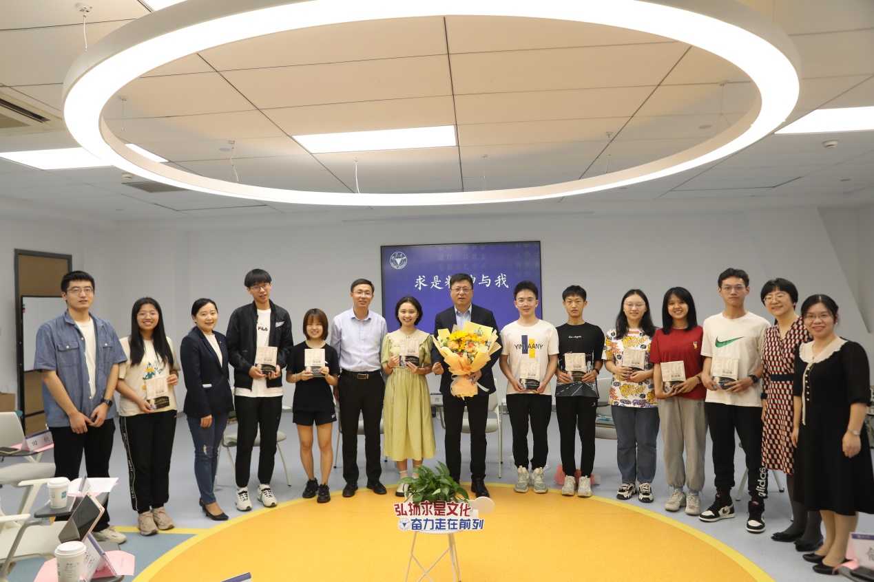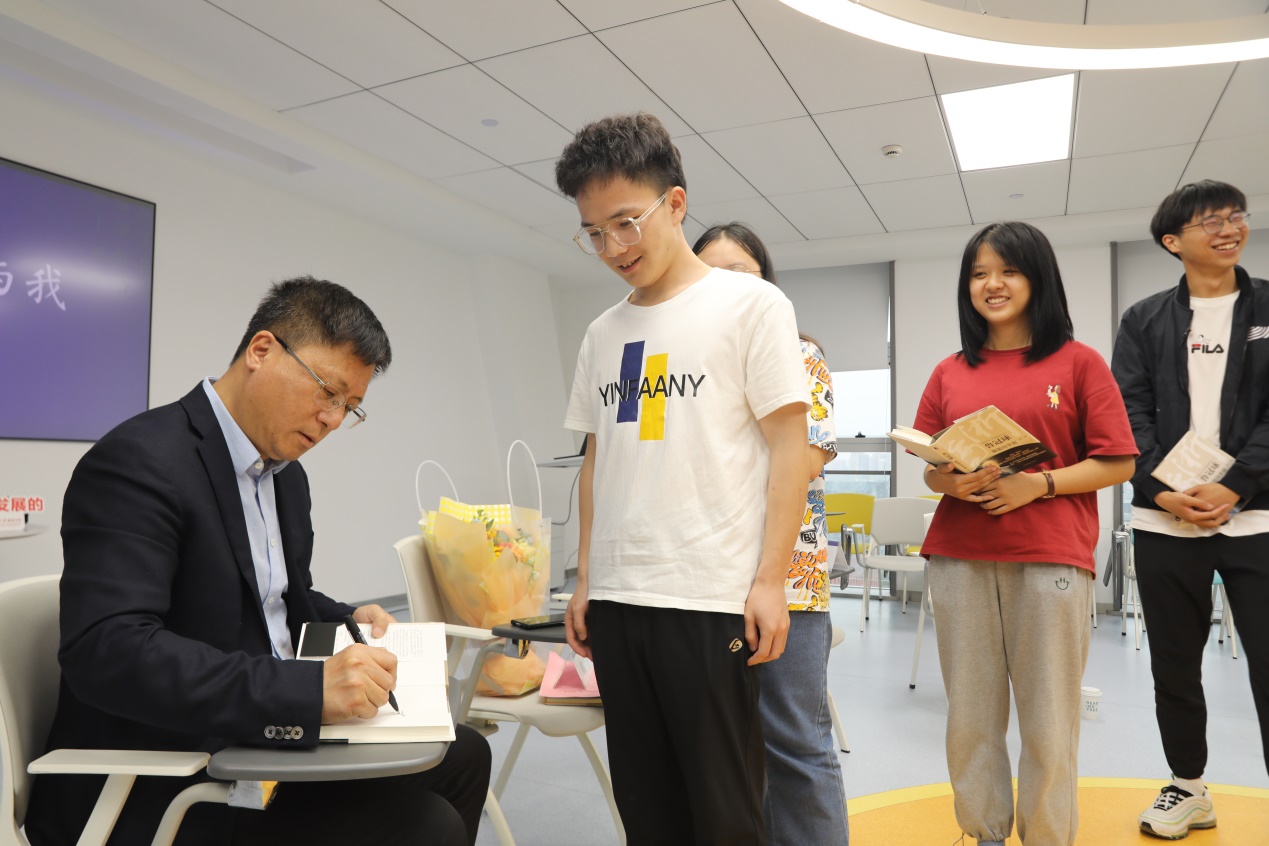 分享结束后,魏江老师为前来参加本次圆桌沙龙的每一位同学赠送了自己所著的两本书《鲁冠球:聚能向宇宙》《数字创新》,希望同学们从中感悟求是精神,把握时代际遇,朝着更高目标和追求,将商学逻辑中“创业家、战略家、创新家、哲学家”四大特质的集合演绎转化为每个人人生出彩的生动实践。学生代表也为魏江老师献花,表示感谢。