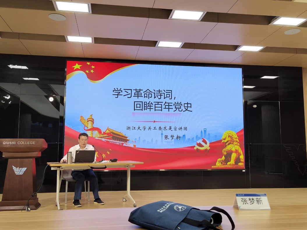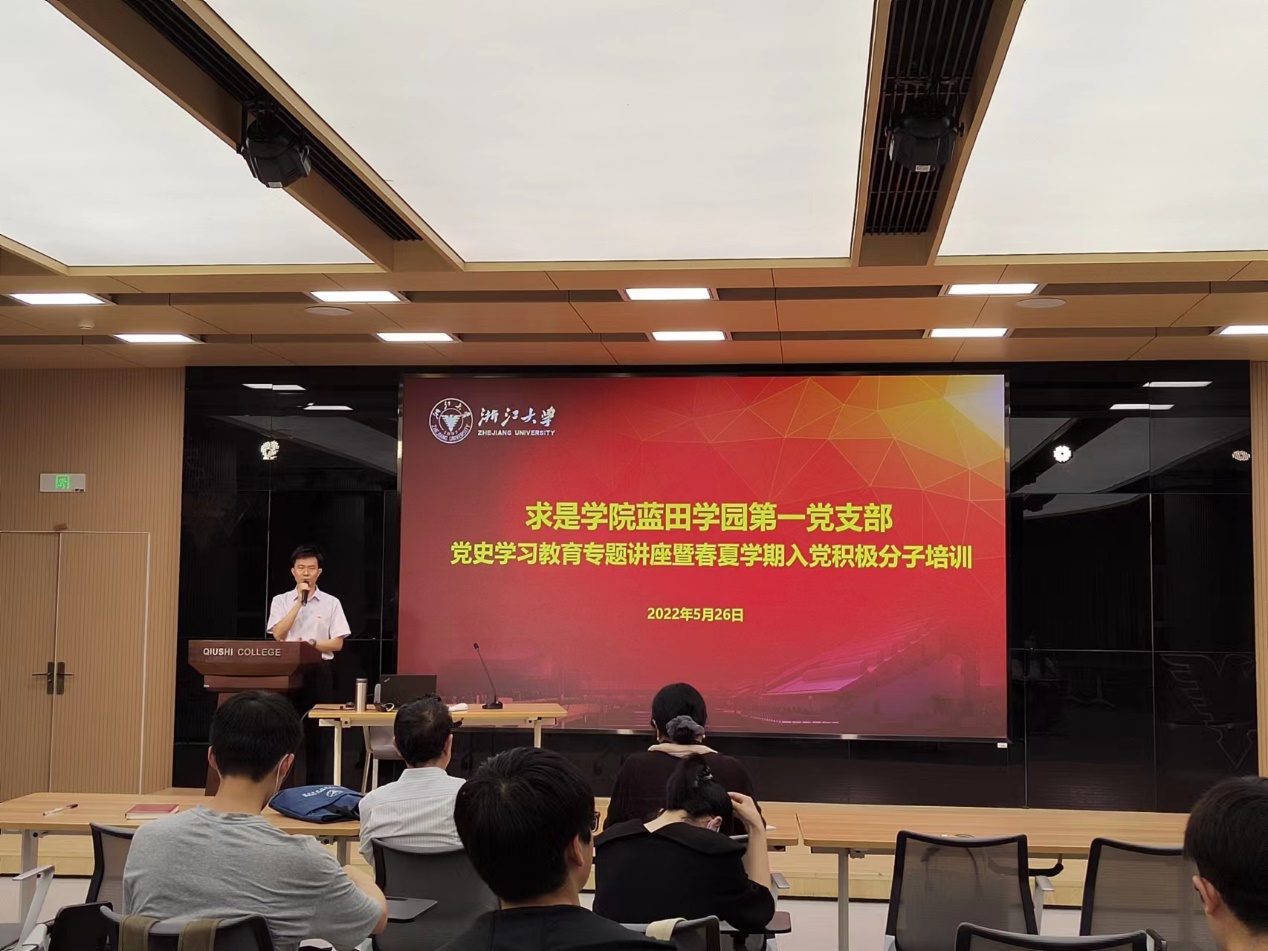 2022年5月26日,蓝田学园第一党支部党史学习教育专题讲座暨春夏学期入党积极分子培训活动在白沙综合楼二楼报告厅顺利举行,本次活动特别邀请到浙江大学关工委求是宣讲团成员、传媒与国际文化学院退休教工党支部书记张梦新教授讲授主题党课《学习革命诗词,回眸百年党史》。求是学院党委副书记、蓝田学园主任包松出席本次活动,支部党员和入党积极分子代表参加,活动由支部书记董业凯主持,因场地限制未到现场的入党积极分子通过浙大钉直播的形式积极参与。