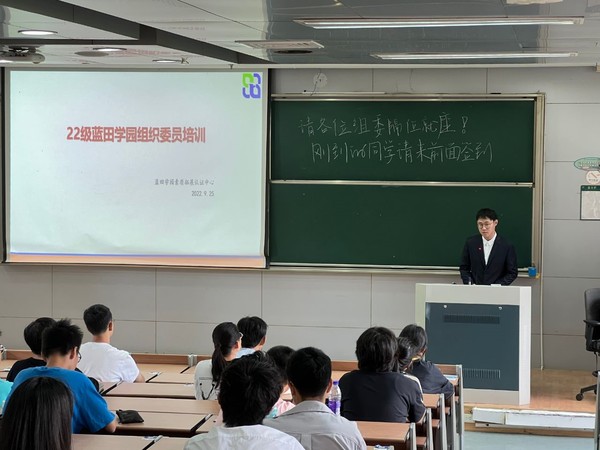 2022年9月25日上午9时,蓝田分团委素质拓展认证中心于西2-209教室召开了2022-2023学年蓝田学园2022级组织委员全体培训大会。参加本次培训大会的有蓝田学园各班级组织委员和分团委素质拓展认证中心全体成员,培训大会主讲人为蓝田分团委素质拓展认证中心部长徐战超学长。