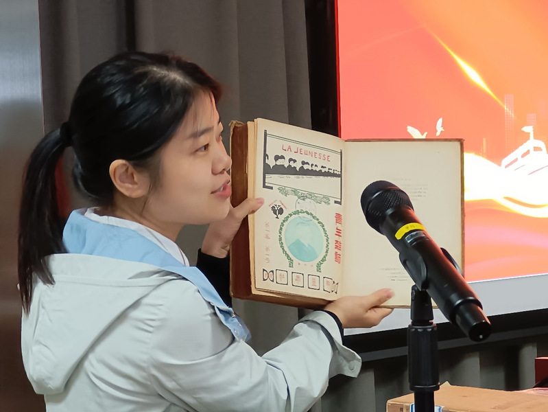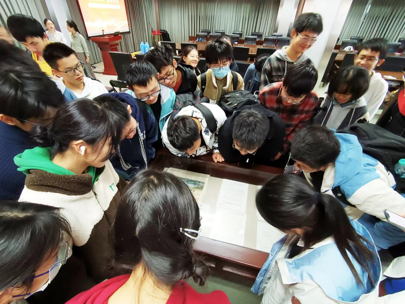 图书馆古籍特藏部副主任吴俊洁老师、推广与合作部主任范晨晓老师结合图书馆红色文献线上展梳理的脉络,带我们重温了波澜壮阔的党史。同学们轻轻翻阅着共产党先驱们曾读过的马克思主义经典著作,在泛黄的纸张和略微模糊的字迹中感受情怀与使命,在对先烈的缅怀之中感悟着他们熠熠生辉的思想精神。吴俊洁老师鼓励大家多读经典作品,并给大家推荐了《共产党宣言》、《赤都心史》及《西行漫记》等红色书籍。随后,吴俊洁老师带同学们参观了基地“牢记嘱托”展区,在这里,同学们近距离感受习近平总书记对浙江大学的关怀——“浙江大学是我的联系单位,我始终牵挂着浙江大学的发展和进步”“创新是世界一流大学的灵魂和核心竞争力”“要发扬当年浙大西迁湄潭艰苦创业、培养大师的办学精神”。习近平总书记的殷殷嘱托和谆谆教诲,始终温暖和激励着现场的学子,也给在场每一位同学的心中注入奋进力量与崇高信仰。
