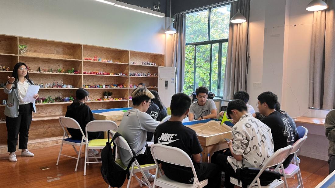 在参与者自由落座分桌后,蒋闰婧老师首先引导同学们放松心情,观察沙盘,体验沙子,帮助大家理解有关沙盘游戏的基本概念。随后,蒋老师向同学们介绍了本次活动的主题——我心中的“一站式”学生社区,并讲解了沙盘游戏的操作规则,要求每一桌参与者在不说话的前提下,通过移动沙子和摆放沙具共同完成一幅主题沙盘作品。